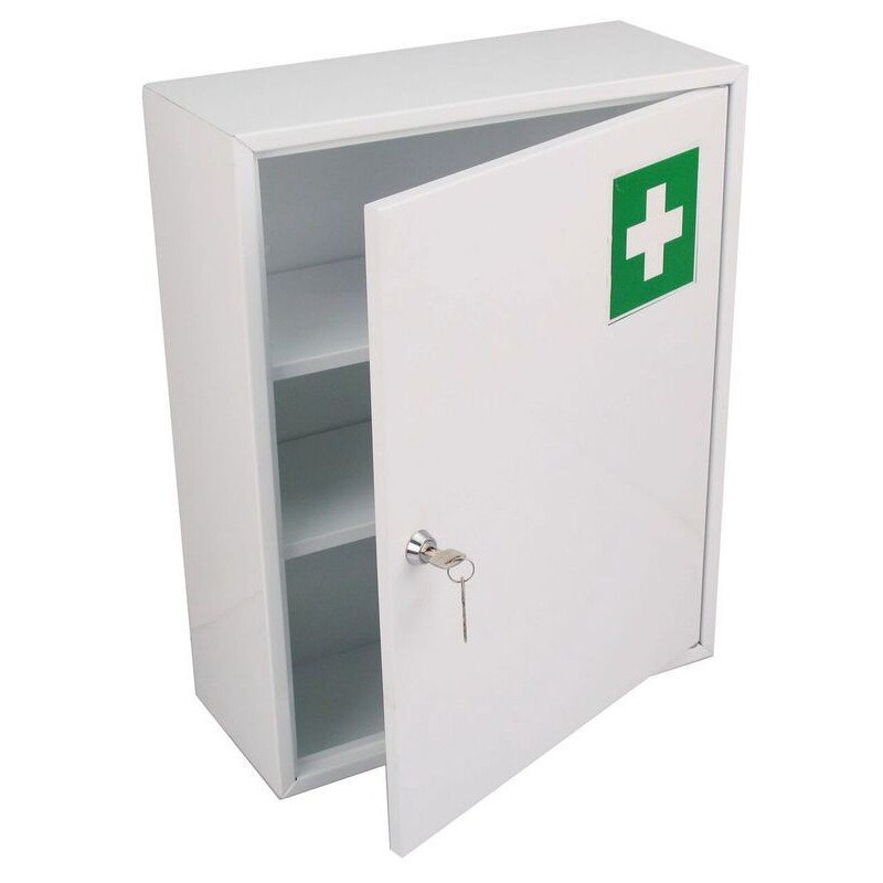 Armoire à pharmacie : corps, porte et étagères en acier poudré époxy, 2 étagères en métal.